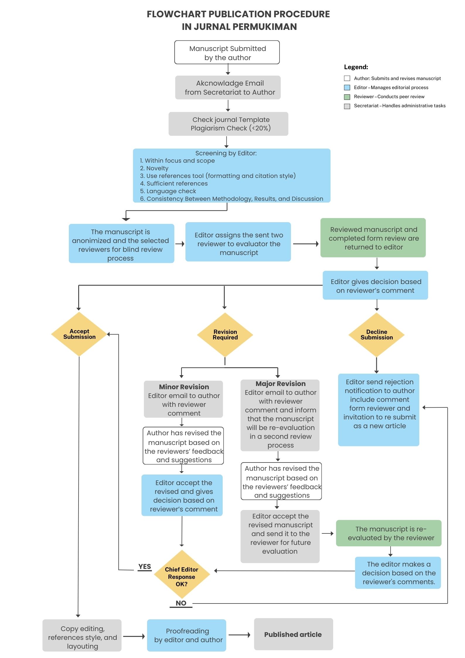 All manuscripts submitted to Jurnal Permukiman must comply with the journal's author guidelines. Upon submission, authors will receive an acknowledgment email from the editorial team. Each manuscript then undergoes an Initial Screening conducted by the editor to ensure: (1) relevance to the journal’s focus and scope; (2) novelty of the research; (3) proper use of citation tools and adherence to the required formatting style; (4) adequacy and relevance of references; and (5) clarity and quality of language.
